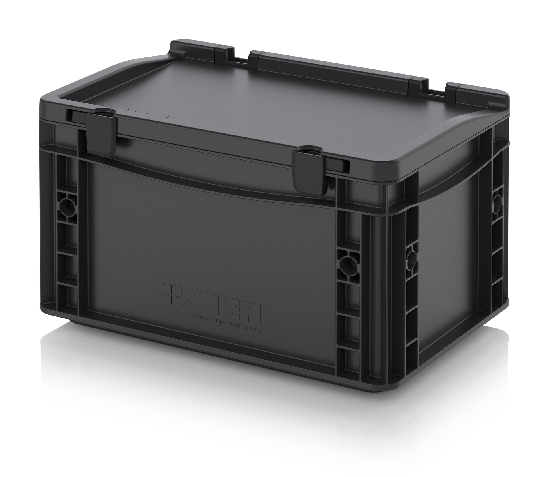 Евроконтейнер с ESD-защитой производства компании AUER Packaging изготавливается из антистатической пластмассы, что делает его пригодным, в частности, для надежного хранения и транспортировки электронной продукции.
