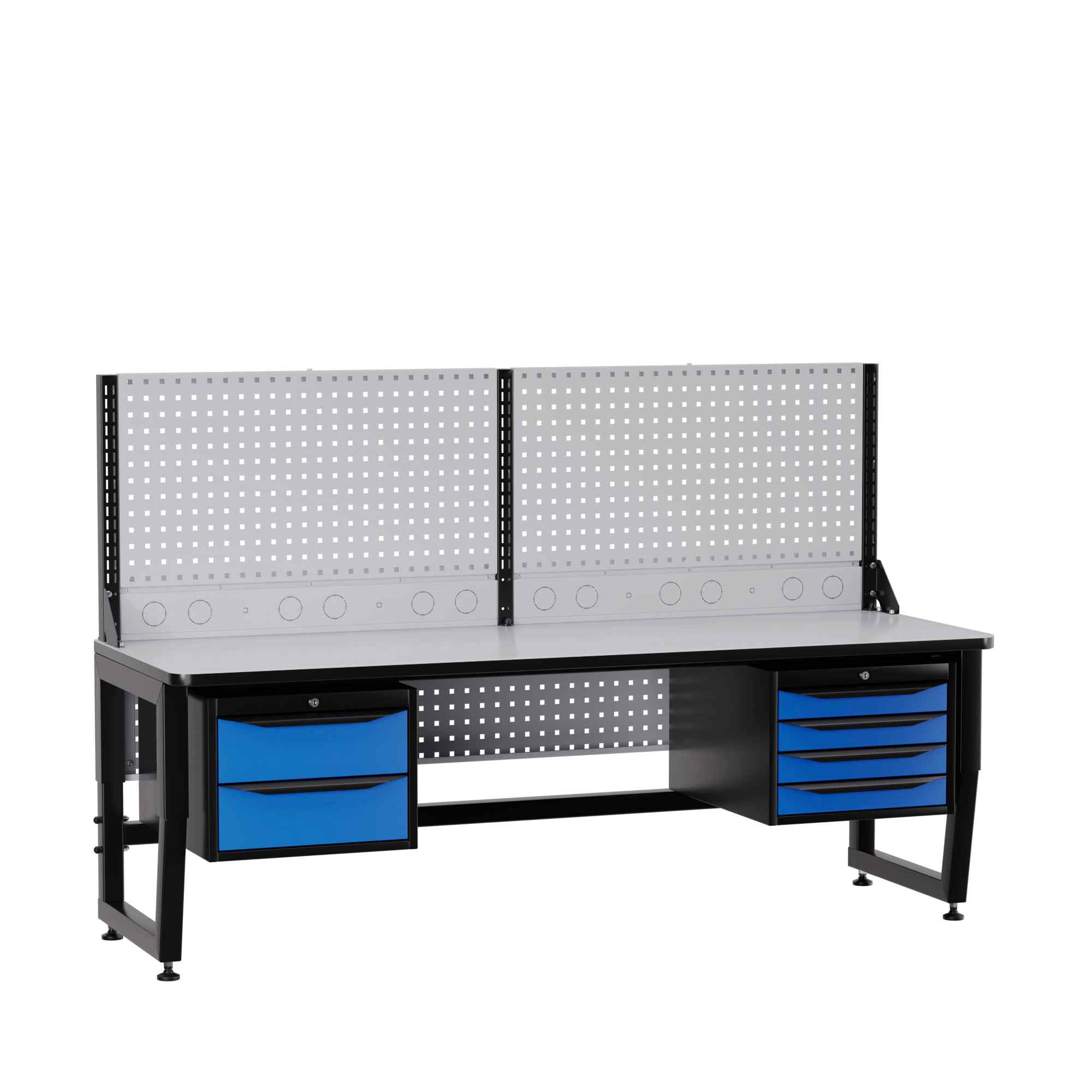 Несущая конструкция стола – это промышленный ESD каркас. Сочетание опорных, несущих и усиливающих элементов из металла, обеспечивают высокую надежность конструкции при интенсивной промышленной эксплуатации с распределенными нагрузками на рабочее место до 300 кг.  Регулируемые опоры с возможностью плавной регулировки по высоте позволяют установить удобную высоту рабочей поверхности от 700мм до 850мм. Специальное ESD полимерное покрытие элементов каркаса с  сопротивлением 1 МОм обеспечивают антистатические свойства изделия<br />
