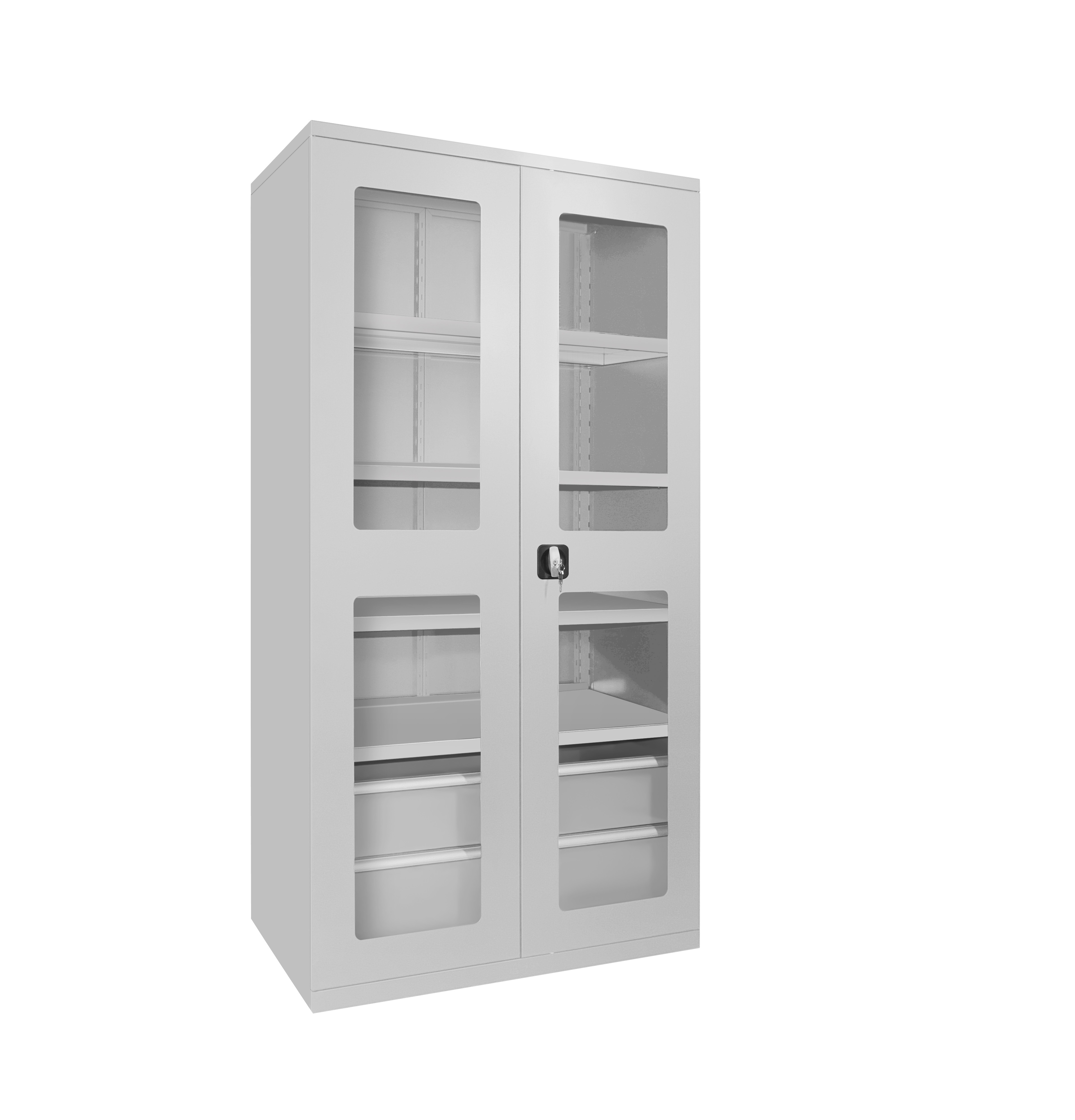 Шкаф ШДП содержит 4 полки 1100х545х35 мм с шагом регулировки 50 мм и 2 ящика — 920х505х160 мм с шагом регулировки 40 мм. Ящики шкафа для упорядоченного хранения комплектующих можно оборудовать разделителями (перегородками). Ручки ящиков изготовлены из алюминиевого профиля с анодированным покрытием и боковые пазами, для обозначения (маркировки) ящиков по их прямому назначению (документация, инструменты, комплектующие, материалы и т.д.).