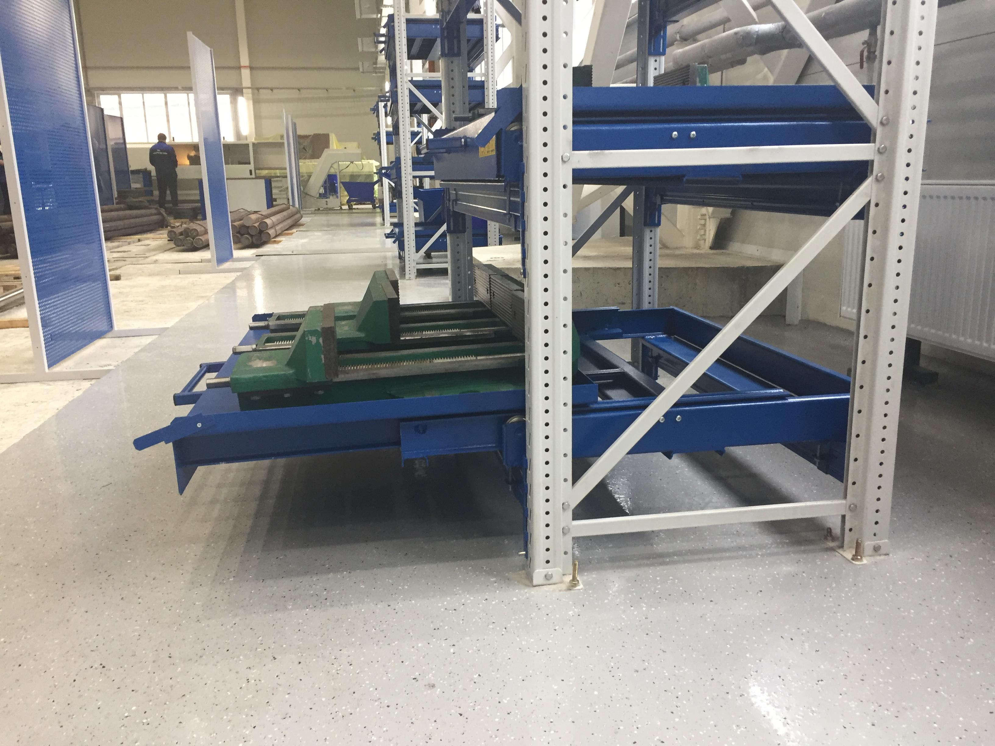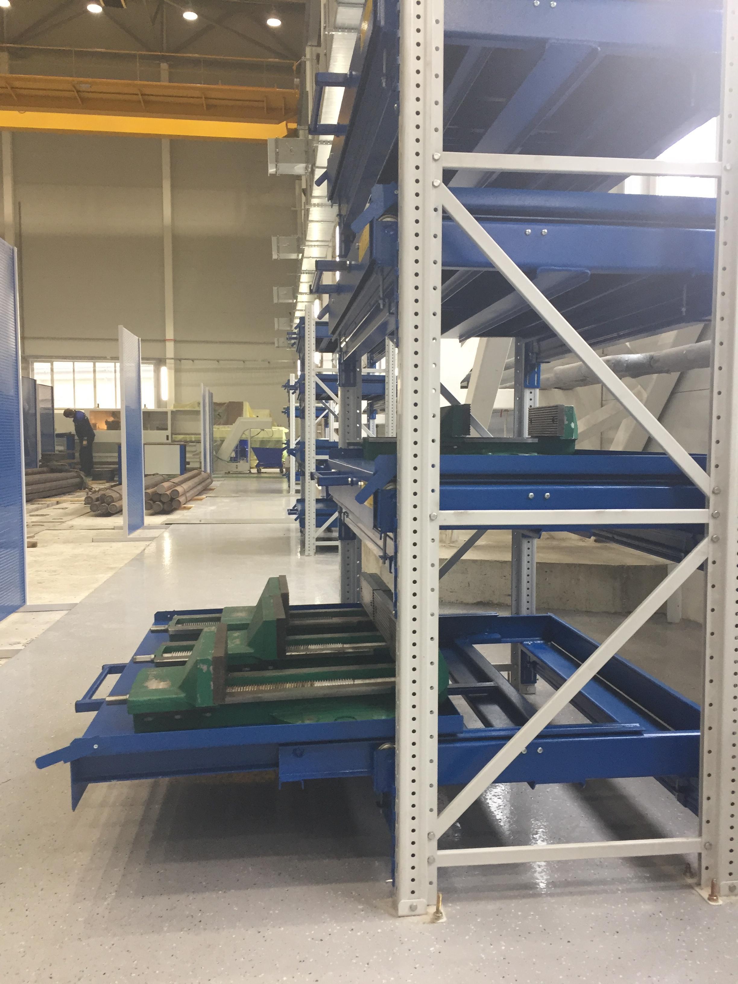 - Выкатная платформа на шарикоподшипниковых направляющих, закрепленных на балках стеллажа при помощи стяжных кронштейнов (4 шт/платформу), с ручкой и фиксатором (блокировка выкатывания)